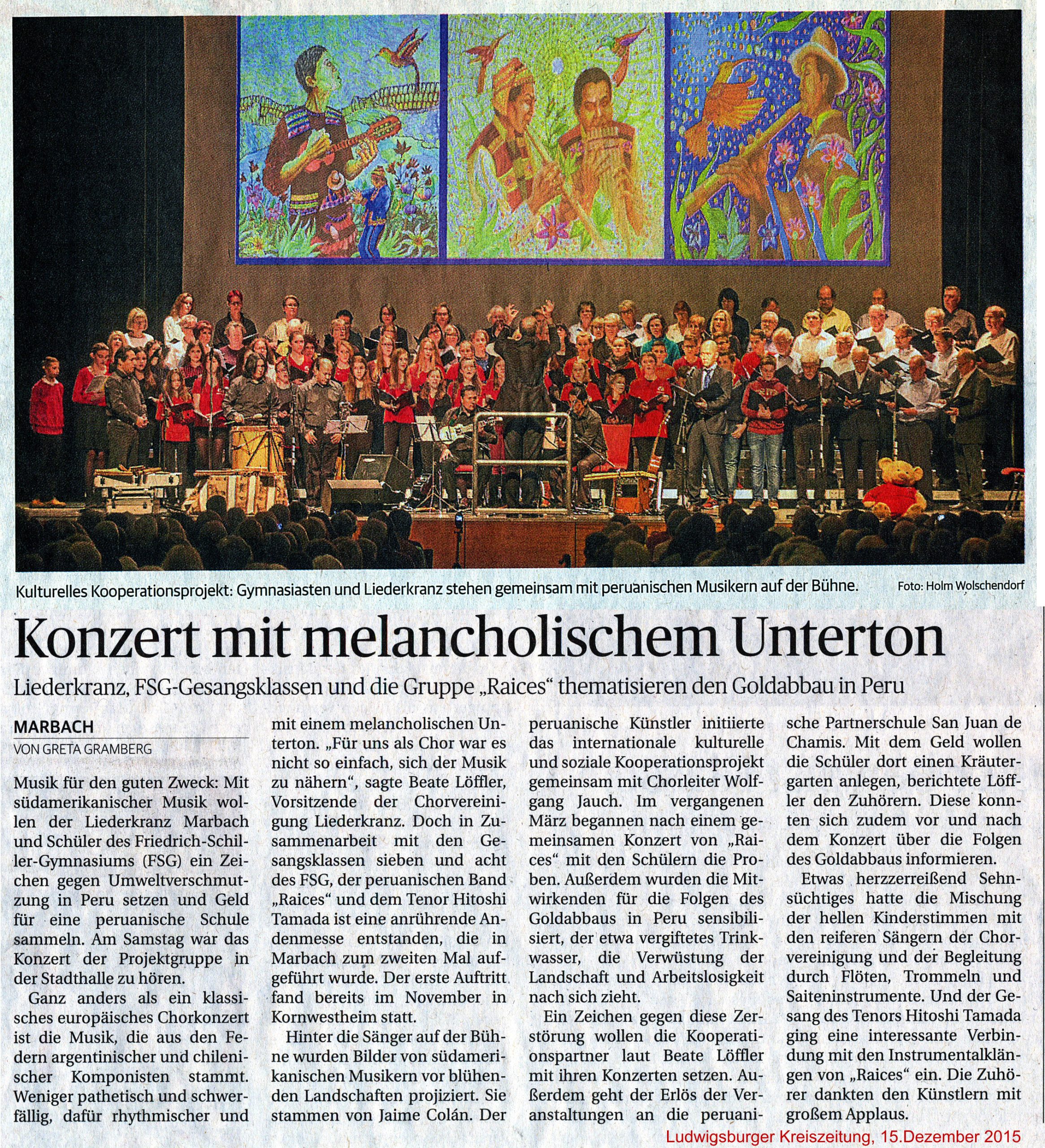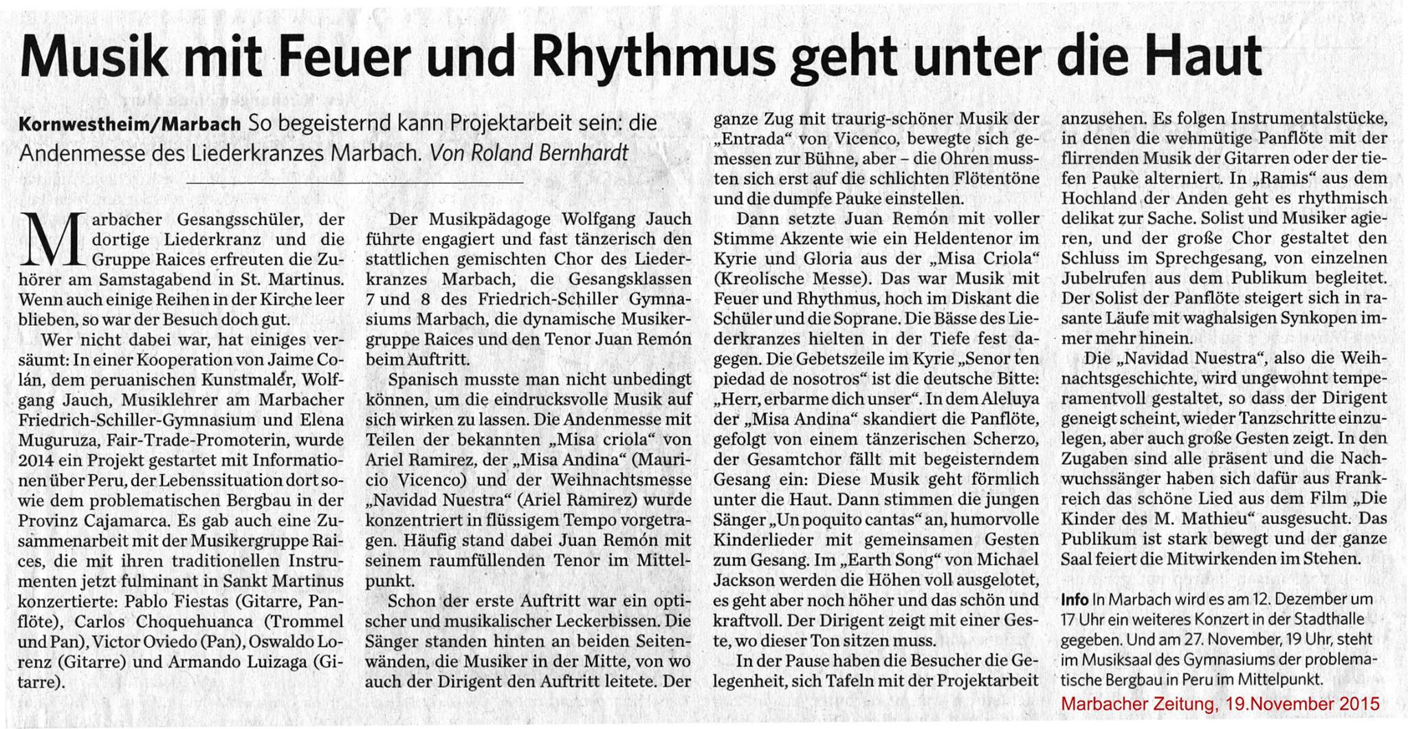 Das Projekt wurde im Jahr 2014 von dem peruanischen Kunstmaler Jaime Colán, dem Musiklehrer und Chorleiter Wolfgang Jauch und der peruanischen Fair-Trade-Promoterin Elena Muguruza initiiert. Nachdem die Schulleitung des Friedrich-Schiller-Gymnasiums und die Chorvereinigung Liederkranz Marbach e. V. einer Kooperation zugestimmt hatten, stellte Elena Muguruza den Kontakt zu unserer Partnerschule in San Juan de Chamis in der peruanischen Provinz Cajamarca her. Von Anfang mit dabei waren auch die Musiker der Gruppe „Raices“.