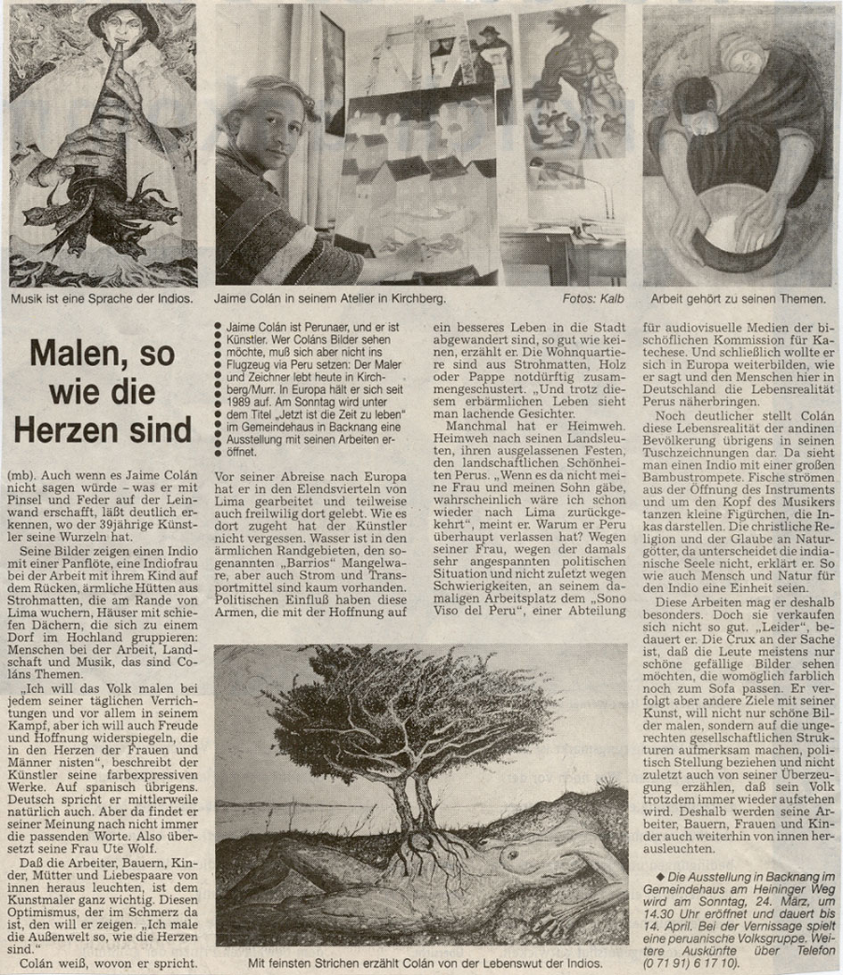 Die geschundene, leidende Kreatur ist ein wiederkehrendes Thema des peruanischen Malers und seine Art, auf die Missachtung der Menschenrechte in seiner heimat aufmerksam zu machen. Nie aber ist Leid für Colán ausweglos. “Ich will das Volk malen bei jeder seiner täglichen Verrichtungen und vor allem in seinem Kampf. Aber ich will auch Freude und Hoffnung widerspiegeln”, sagt er.